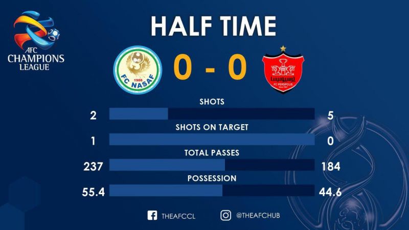 نسف قارشی که دو بازی قبلی خود در استادیوم خانگی را با پیروزی برابر السد و الوصل خاتمه داده بودند، اینبار برابر پرسپولیس علیرغم در اختیار داشتن مالکیت توپ در دستیابی به پیروزی در نیمه اول ناکام بودند و باید دید در پایان بازی چه نتیجه‌ای برای آنها ثبت خواهد شد.