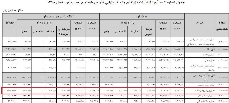 در جدول شماره 7 به بخشهای مختلف ورزش از جمله وزارت ورزش و جوانان، شرکت سهامی توسعه و نگهداری اماکن ورزشی کشور، کمیته ملی المپیک و کمیته ملی پارالمپیک اشاره شده که بودجه هر کدام از این بخشها افزایش یافته است. بودجه وزارت ورزش وجوانان با افزایش نزدیک به 10 درصدی به عدد 1166 میلیارد و 565 میلیون تومان، بودجه کمیته ملی المپیک به 74.5 میلیارد تومان و بودجه کمیته ملی پارالمپیک به 31.6 میلیارد تومان رسیده است. همه این ارگانها نیز افزایش بودجه نسبت به سال 97 داشتهاند.