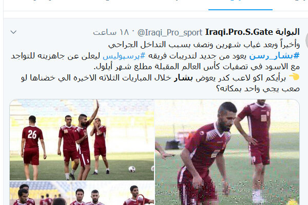 حساب «البوابه» عراق در این خصوص نوشت: «بعد از غیبت دو ماه و نیمه به خاطر جراحی، بشار رسن به تمرینات پرسپولیس بازگشت تا آمادگی اش برای همراهی عراق در مرحله مقدماتی انتخابی جام جهانی را اعلام کند.»