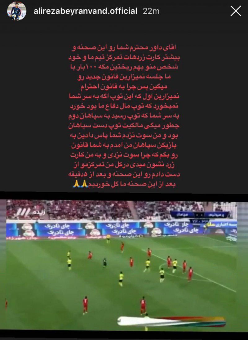 به گزارش فوتبالی، به نقل از ایلنا، علیرضا بیرانوند، گلر پرسپولیس در صفحه شخصی خودش با قرار دادن ویدیوی مربوط به برخورد توپ با سر داور مسابقه با سپاهان عنوان کرد که به خاطر درخواست توقف بازی از وی کارت زرد گرفته و همین موضوع باعث شده تمرکزش را از دست بدهد و 5 دقیقه بعد دروازهاش باز شود.