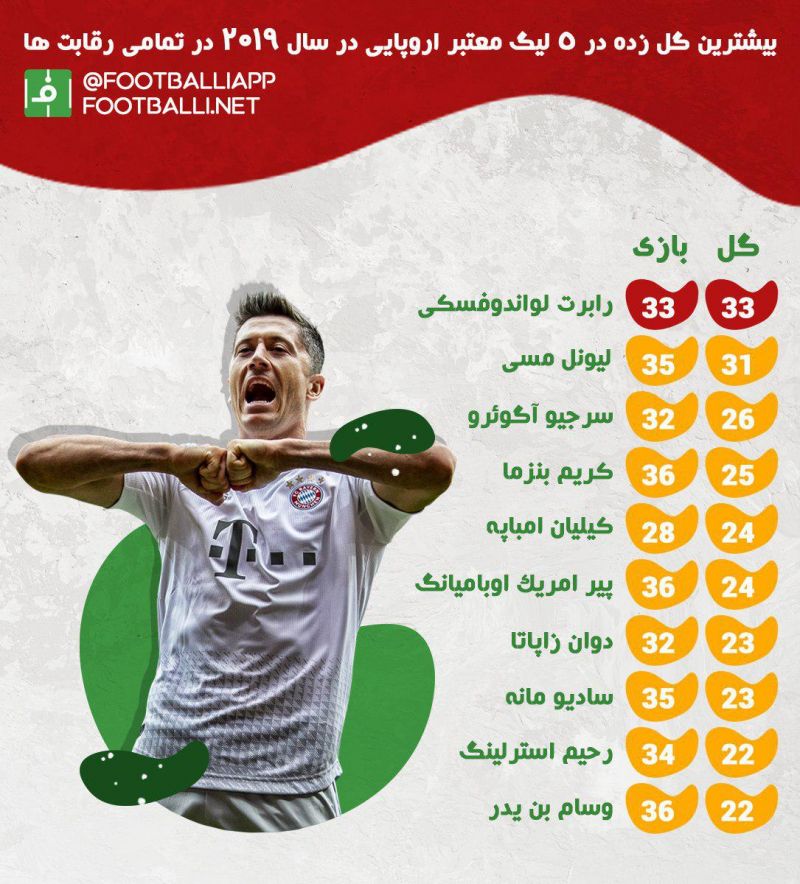 اینفوگرافی اختصاصی/ بیشترین گل زده در 5 لیگ معتبر اروپایی در سال 2019 در تمامی‌ رقابت‌ها
